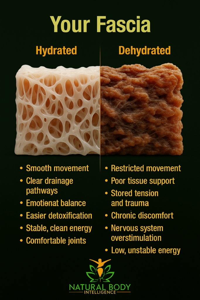 Fascia depends heavily on hydration — but not from drinking plain water. It requires water that is held within the tissues, which comes from fruits, vegetables, and natural foods. This structured water bathes the extracellular matrix and allows fascia to slide smoothly.