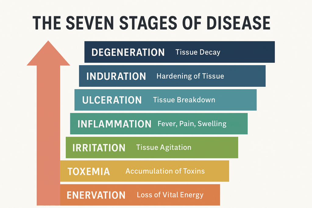 The seven stages of disease explain how the body responds to internal stress and toxicity, gradually moving from vitality toward degeneration when the causes of irritation are not removed. Each stage represents the body’s attempt to maintain life, balance, and cleanliness in the face of overload.